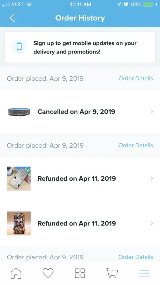 I placed a order on wish for a 64" TV for 1$ the order was placed and process on the 3de day I ask for my tracking number and hour later my order was canceled and I was refunded, its unacceptable, apparently the store ran out of stock, but I think they made a mistake with the price and withdrew my purchase intensely. I want what I purchase for, it's not my mistake. Bad service indeed