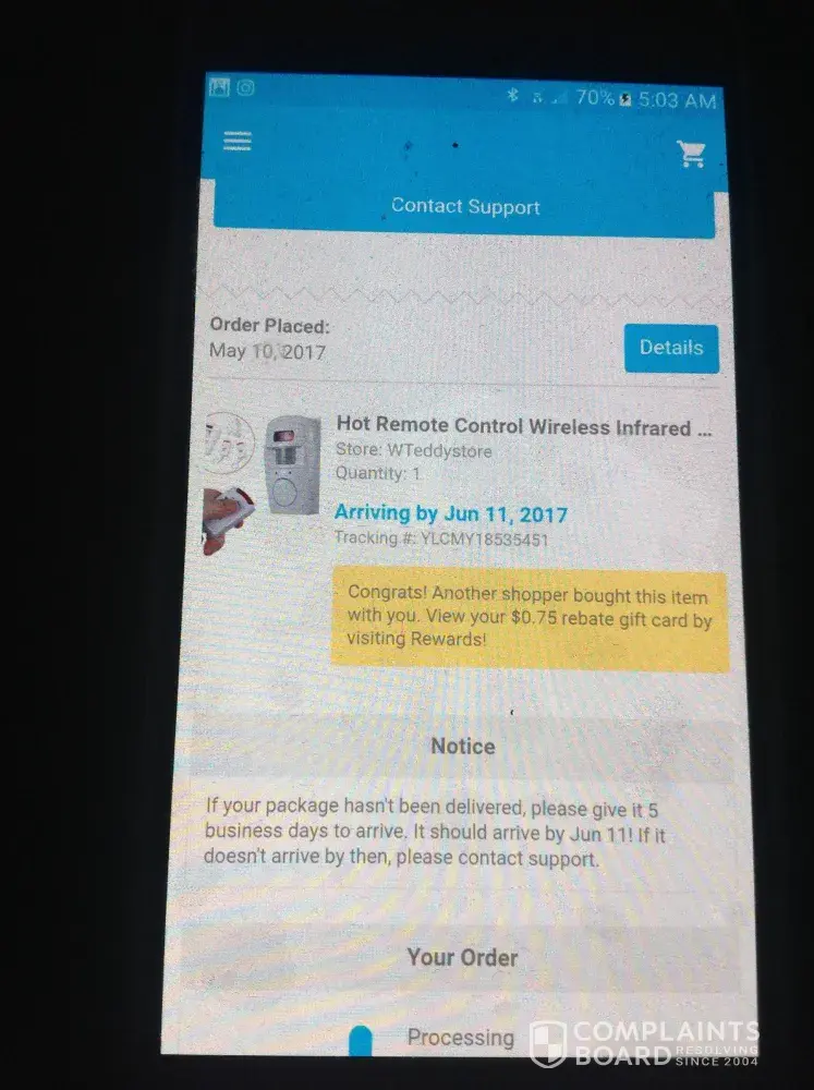 Here is the first order I got tracking no #YT171310621440627 I got that one May 10, 2017 the order one till to date I did not received anything Hot Remote control wireless infrared told that was sent to who. You lied about some orders I don't have your cell phone I would have called you all my effort to rich you was zero. Tracking no of this #YLMY18535451 was not received till date. Very painful