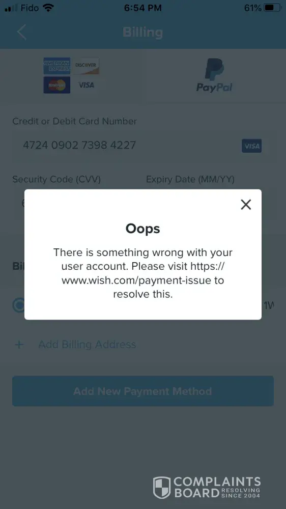 Every time when tried to submit my payment this message would appear There is something wrong with your user account please visit www.wish.com/payment issue to resolve this