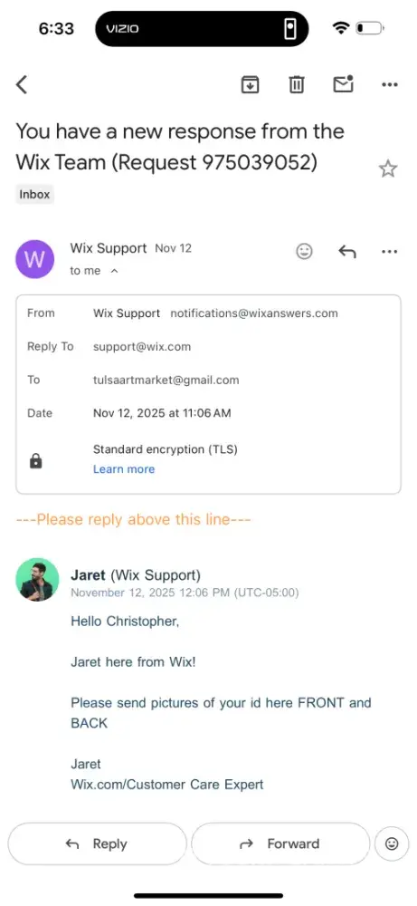 On May 26th, 2023, I made a sale for $8500 plus tax, paid by American Express. Everything seemed fine at first, but soon after the payment was made, I received an email from Wix saying that I needed to update my bank information. This was really confusing to me, because my bank information hadn't changed in 5 years. But I figured it was just a mistake, so I called Wix to try to sort it out.