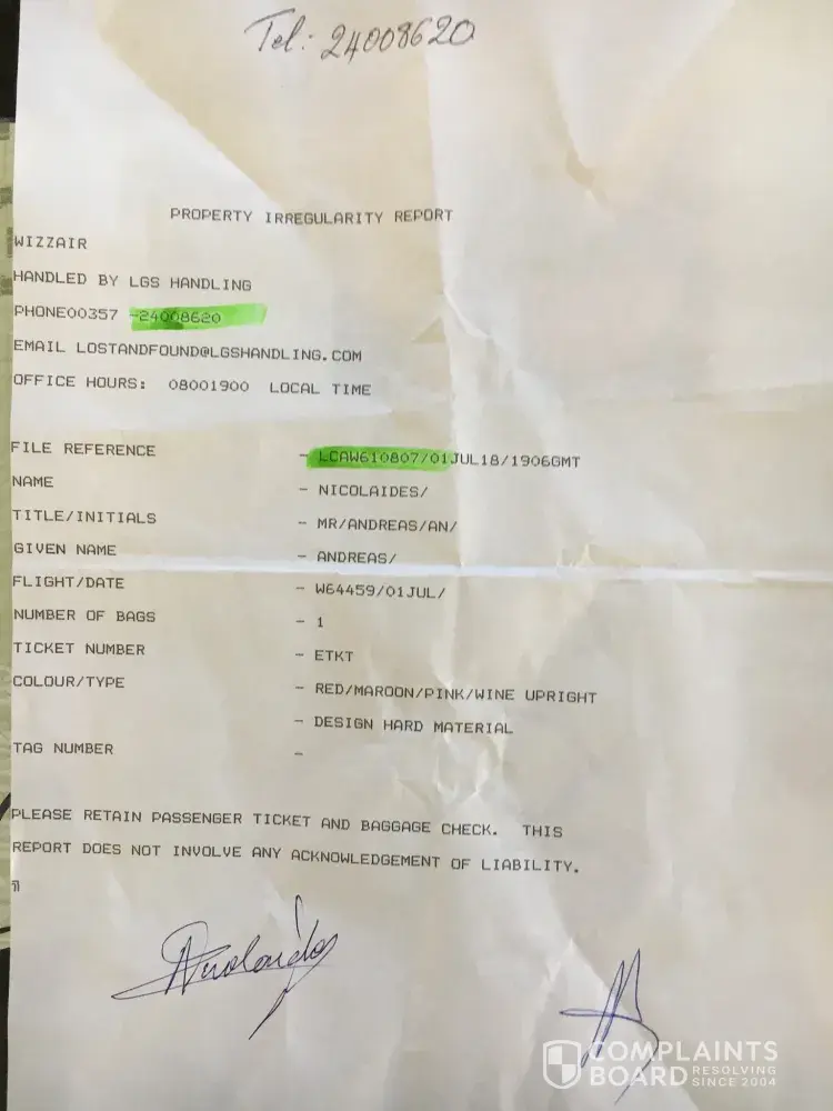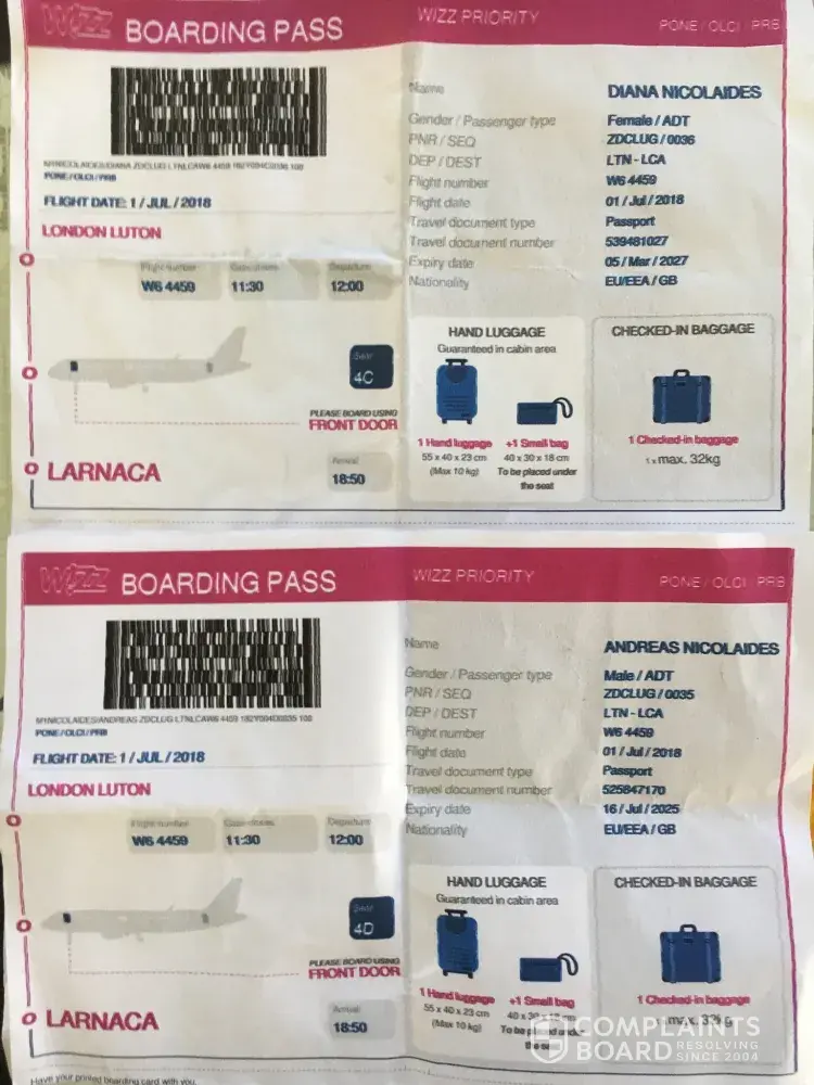On July 1st my wife, Diana Nicolaides, and I, Andreas Nicolaides, PNR ZDCLUG, were flying from London Luton airport to Cyprus Larnaca airport with wizz air flight number w64459 scheduled to depart at 12:00 noon, at the check-in desk the person who served us explained that as wizz priority passengers we were allowed to check-in the 2 x 32kg baggages as well as the 10kg hand luggage which we were very happy to do so.