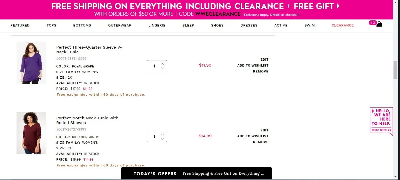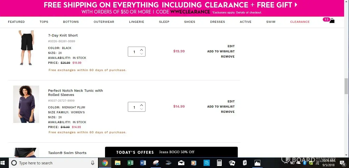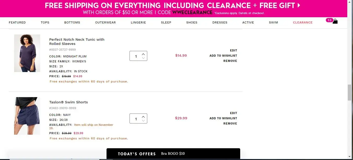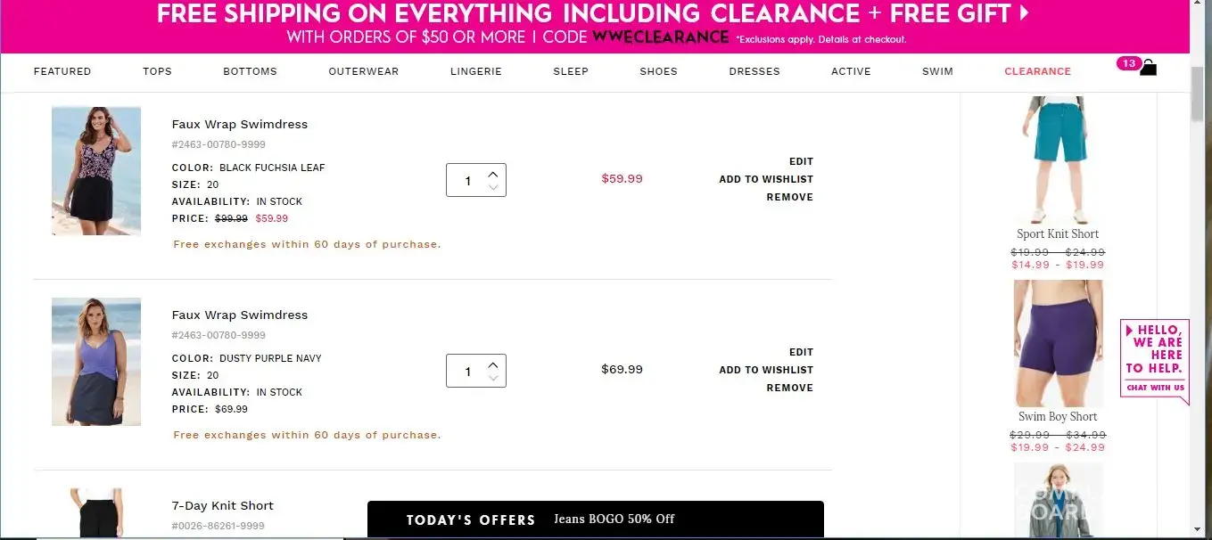 Now I just went back into my cart to take another screen print of what I had in there and the WW c/s rep added a pair of shorts. I know that I did not add them because I would NEVER wear something so short! I am livid. (It would be the Taslon swim shorts)