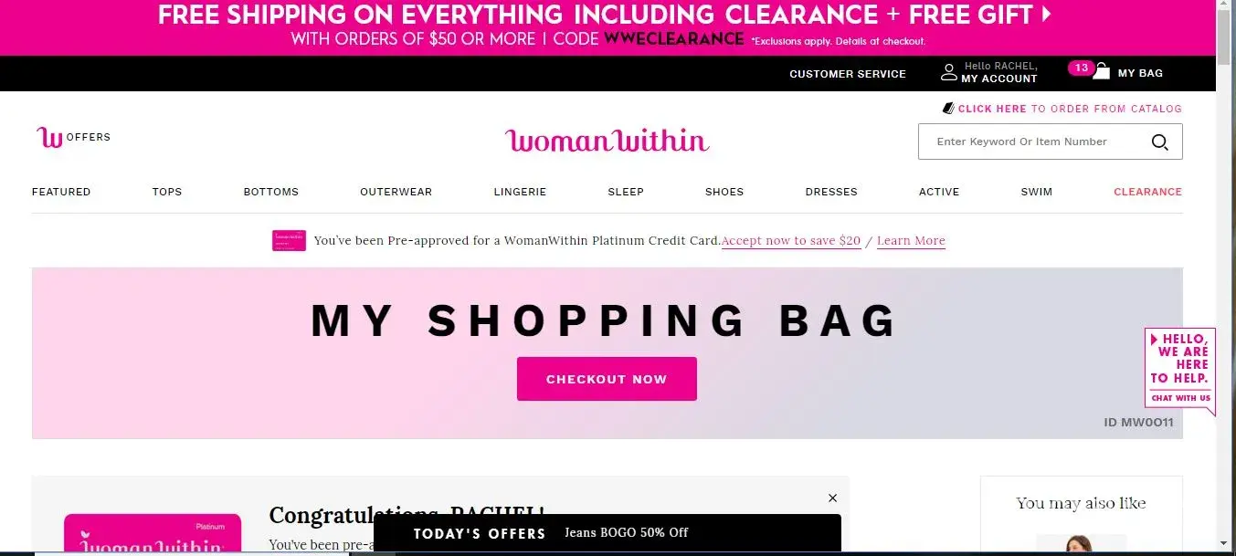 Called customer service and spoke to a girl who sounded bored to death and said my shopping bag id didn't produce my bag and yes the code should work but it didn't and she didn't know why and if I wanted to read every item number to her maybe she could place the order. I had to leave for church and I said no. After dinner I ca;ed customer service again. I said this is my 3rd call today and she groaned and said oh no hat's the problem. I went through it all again and she said you are right it should work, hold on I am going to get a new item number for the product (shoes). She came back and said ok and then I heard it... Click. Yep call lost and I gave up. I emptied the shopping bag and I am done. One whole day I can never get back wasted on trying to shop at woman within. I have been a customer for years. I have put up with back orders that I opted to cancel and they arrived anyway months later. Along with many other problems but this is the final straw. Your promo codes are a scam. I think you hope we will be so tired by the end we will buy them at full price. Well I am not.