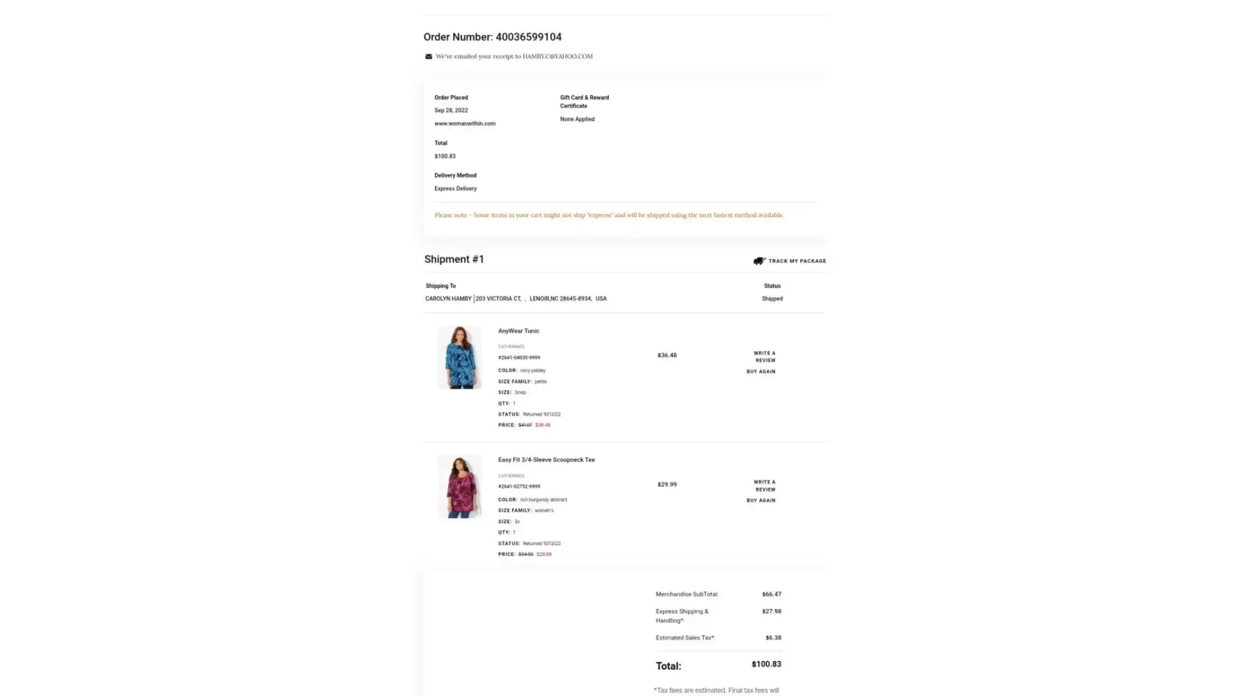 I purchased several articles of clothing from Woman Within. The date purchased, order number and total cost of each order are shown below: