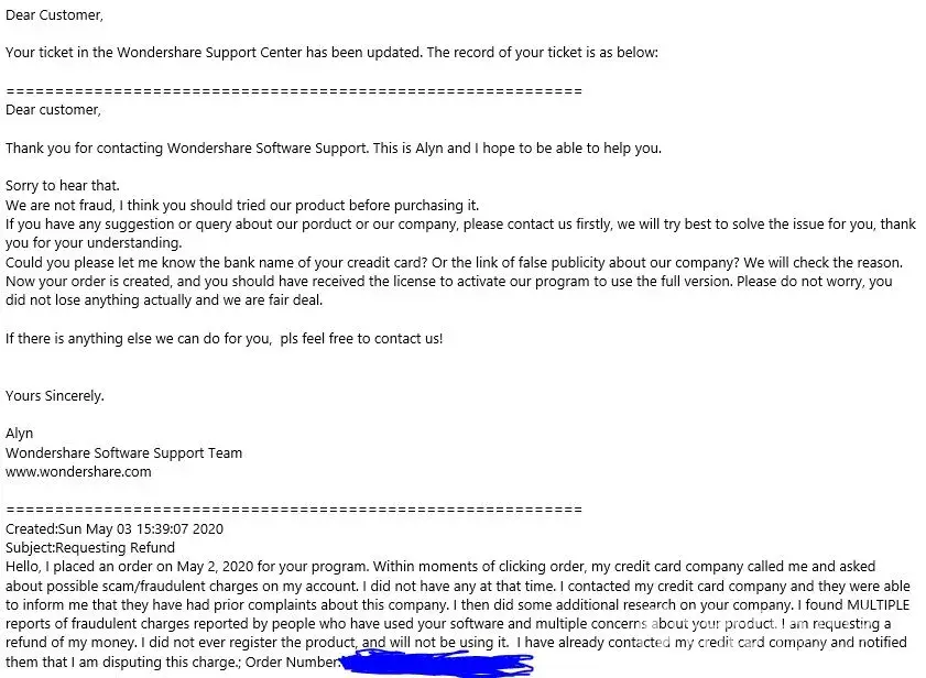 I had read about Wondershare's DVD authoring program. I was trying to turn video files into a DVD. I *thought* I had done my research on the company (I didn't check the BBB first- that would have saved me the time and hassle!). I was thinking whether or not to get the full version (so that the watermark would be removed). I ended up deciding to purchase a "lifetime membership" for $59.95. Within MOMENTS of hitting purchase, my bank's fraud detection department called me. They called 3 times in 15 minutes (I was on the line the first couple of minutes trying to find contact information for Wondershare-good luck! I also then found all the negative reviews and scam complaints, and the "F" rating from the BBB). I immediately put a stop on my credit card (and actually deactivated it/started a new account with the bank). I sent customer service an email asking for a refund/told them that I wanted my money back and that I had already contacted my credit card company to dispute the charge (see photo- it has their response and my initial message). We'll see what happens. BUYER BEWARE!