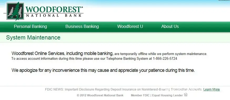 I have a checking account with Woodforest National Bank up at the local Wal Mart store, and I have a substantial amount of money in this account. My problem is that I work from home out of my home office and I do a lot of my transactions late in the evening or early morning. That is not bragging, it is just the truth about how I make my money. This is compounded by the fact that every time I try to check my account online I get some message that says Woodforest Online Banking is not available due to maintenance in progress, please try again later! Well I CAN'T TRY AGAIN LATER, I need to know NOW! So, I figure I can call their so called "24 hour automated account information" telephone line. Again, I am disappointed because the line is always busy or returns an error message on my phone that it is an invalid number, or it actually answers, but when given a list of choices to pick and you click the one you need it immediately hangs up on you! As you can see from the attached image file, the online banking page instructs you to call the automated number... Gee thanks Woodforest, that sinches it, tomorrow I am going down there and taking all of my money out of this keystone cops bank and finding a REAL bank to deal with!