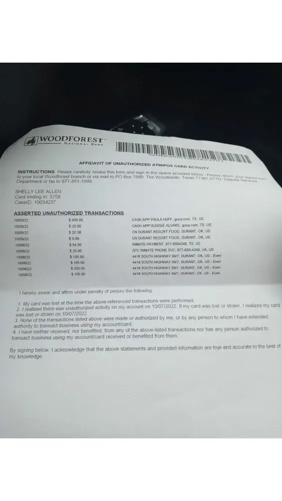 Onb January 1, 2009, I recieved a call from Woodforest in Texas, stating that as the person in question was by my side when I entered the pin, this was not an identity theft. I asked if they had recieved the information that they had requested and was told that she had just recieved it and was reviewing it and would call me back.