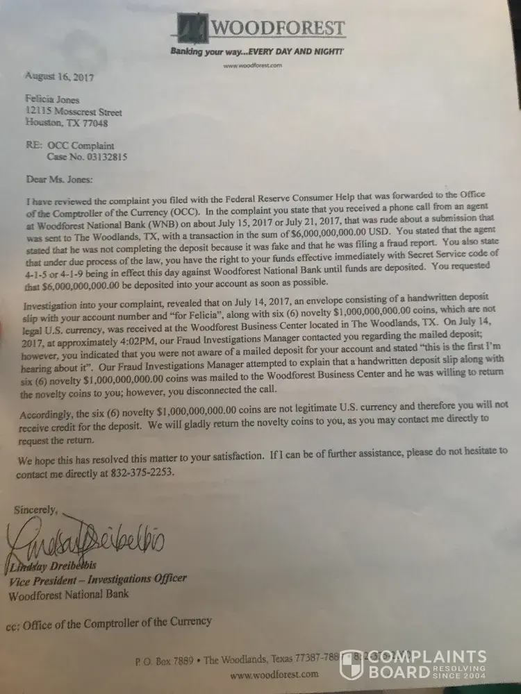 I am waiting for response and received one yesterday b/c of the complaint I submitted. I am waiting to have ALL of my NSF reimbursed because of lack of follow up by the local branch and no responses to my messages. It takes one -two week for Woodforest to respond to messages. I appreciate the contact person calling me yesterday and will wait to see if it is resolved and NSF reimbursed which would also mean that my check for 81 that was rejected twice and others would have been sufficient and funds to covered had they listened and followed my request at the local branch as well as in my messages. Thank you.