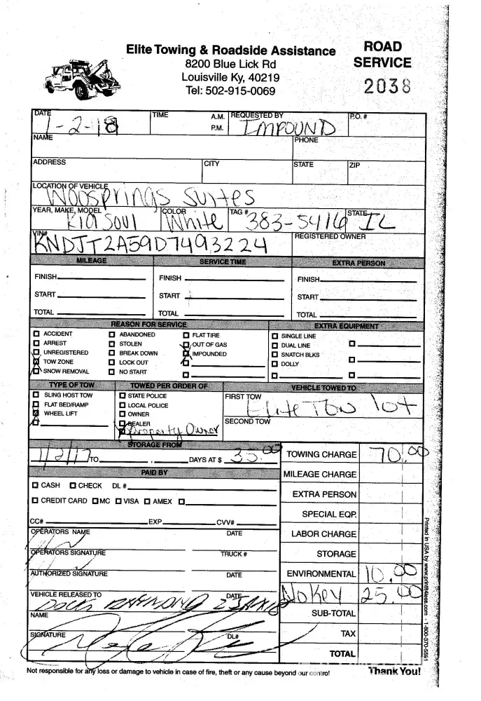 On the evening of the 1st January 2018 my vehicle was illegally towed by your contracted towing service (Elite Towing and Roadside Assistance) because my vehicle was parked in an unmarked fire lane. The Elite Towing receipt clearly shows the property owner authorized the towing. Louisville Metro Ordinance (Chapter 94: Fire Prevention) Subsection 94.82 Fire Hydrants, Water Mains and Water Supply - Fire Lanes (where required by law) Markings and other designation (attached); have clearly been violated by your organization and are subject to Criminal/Civil penalties. Your continued violation of this ordinance dates back to at least December of 2015 (Attached google earth picture) which clearly shows no signs or painting on the pavement designating a fire lane. Other pictures taken the morning of January 2nd 2018 will clearly show no signs posted or designated marking on the pavement as a fire lane.