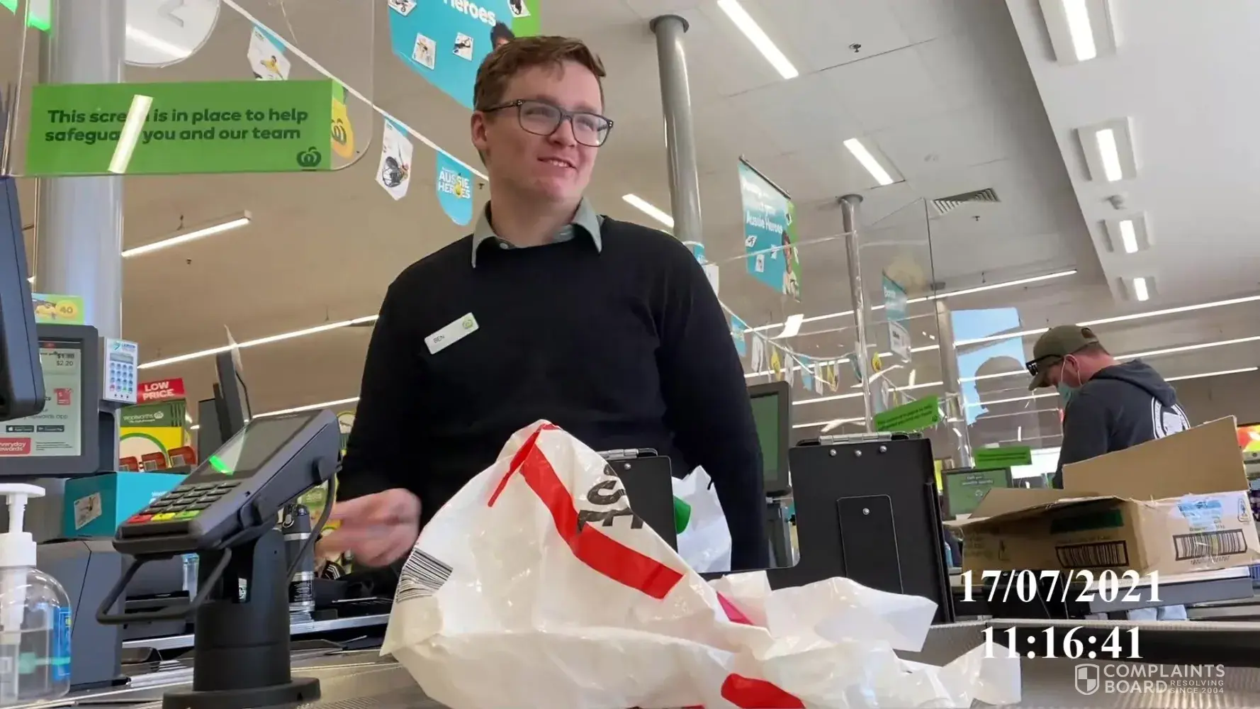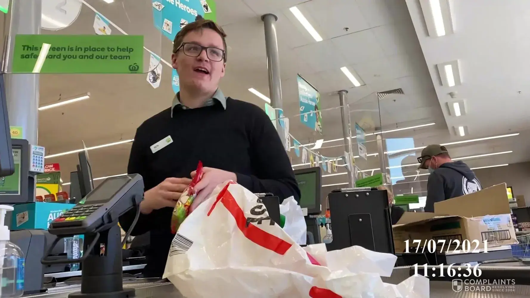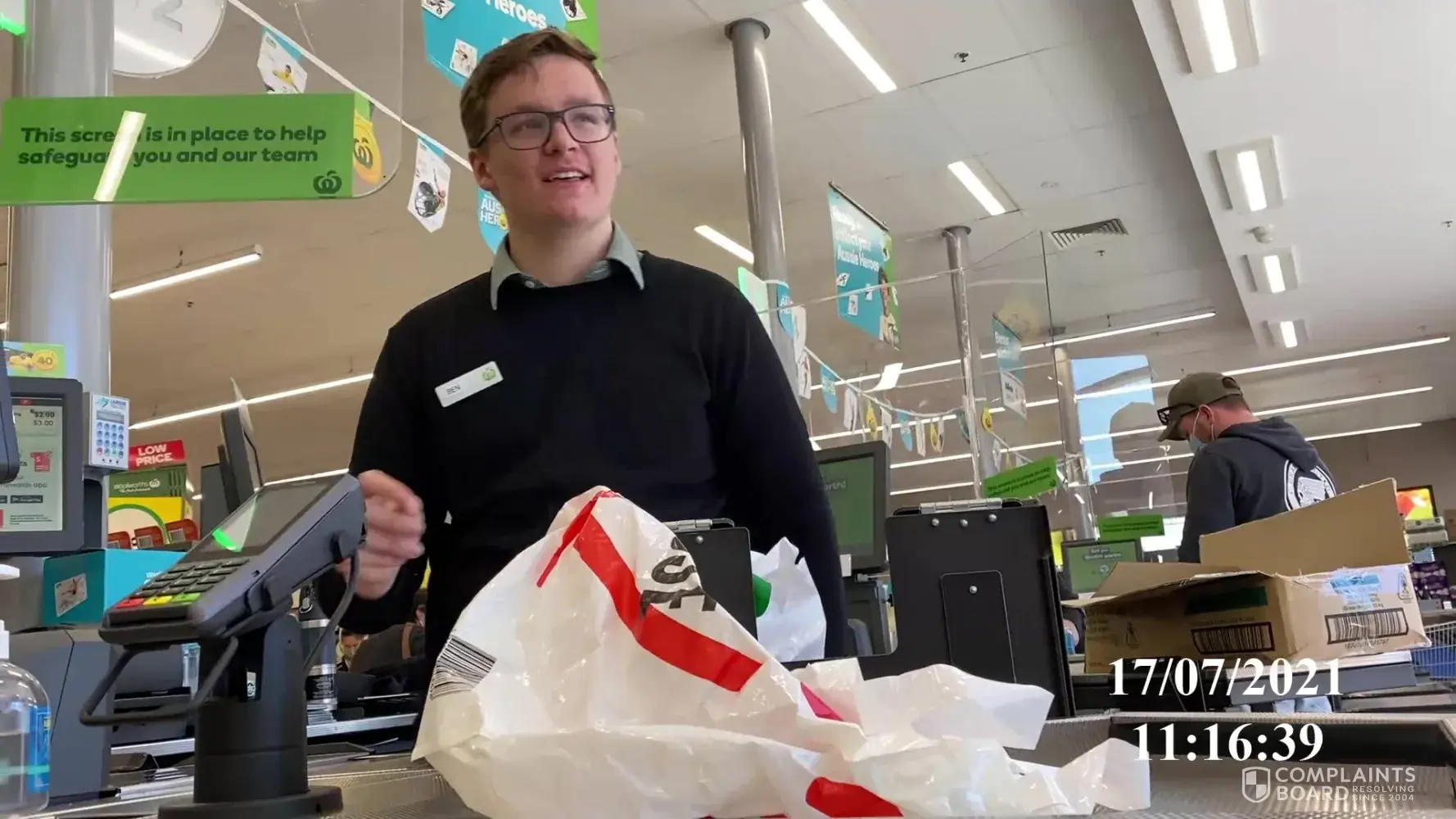 Checkout operator Ben, ID W2710001 serving customers and not wearing a mask when a staff member at the entrance making people check in and wear a mask.. Date 17 July 2021 time of transaction 11:18 am.. Pimpama store ID 2710. Corner of Yawalpa and Dixon Roads Pimpama Qld.