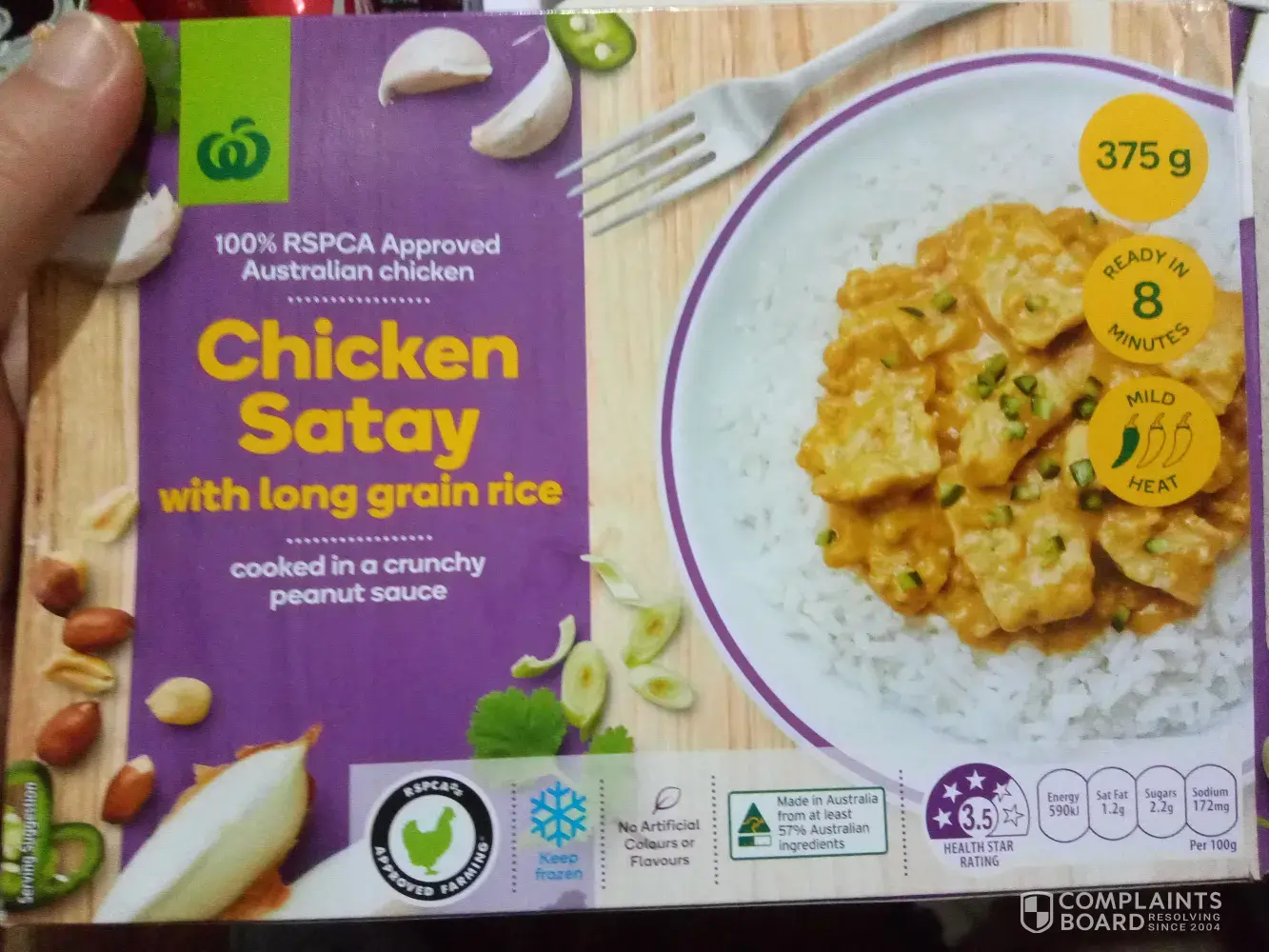 Read full complaintFrozen 375g chicken satay with long grain rice cooked in a crunchy peanut sauce