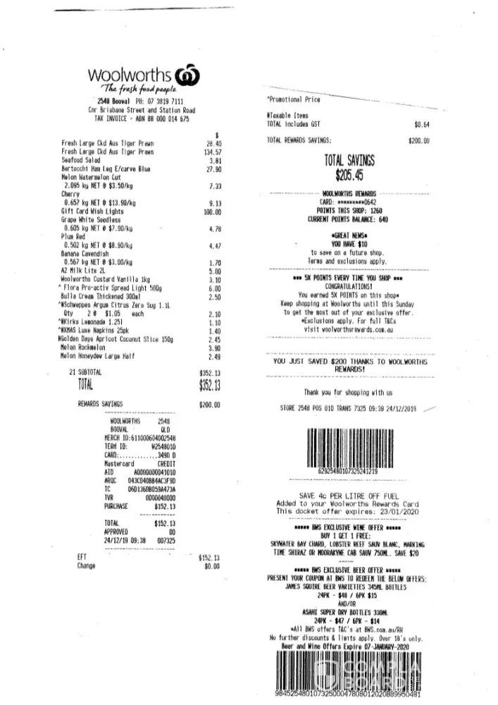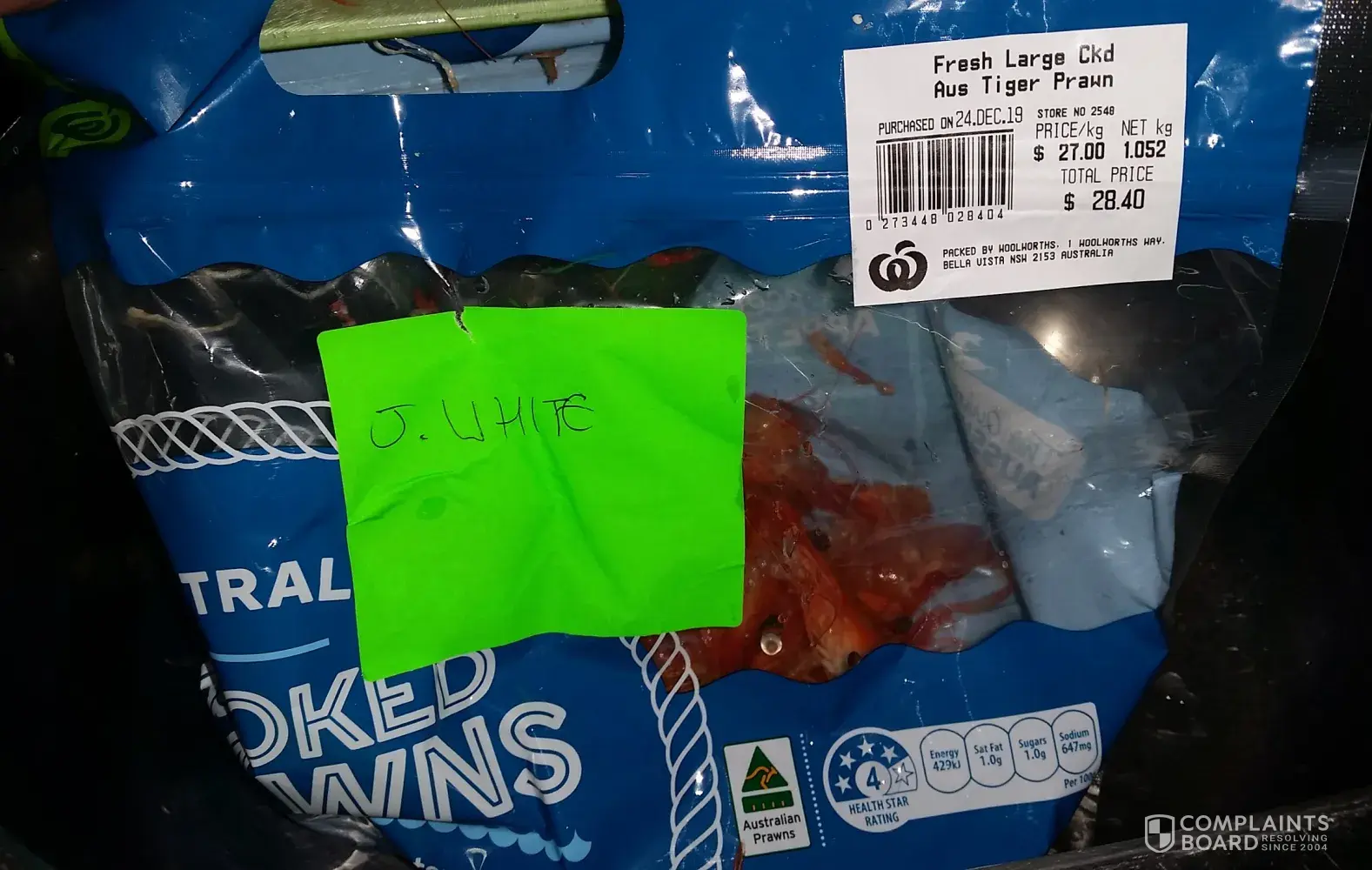 1. We pre-ordered 5 kg of large tiger prawns and collected the order on 24 December 2019 at Woolworths Booval Qld. The order was provided to us in 2 packages. One was basically in a plastic tub which appeared to be pre-packaged from a supplier in Cardwell and indicated a net weight of 4 kg and the other was wrapped up in a plastic bag with a weight of about 1 kg. Attached are photos Pic 1 and Pic 2 of the bar coded price stickers for both packages and a scan of the purchase receipt.