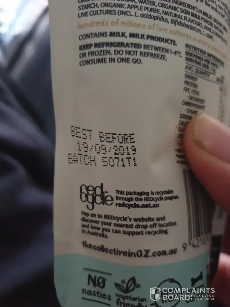 This is about the 3rd time we have bought kids yogurt from different makers. And each time they have been out of date. One variett is a month out of date and another is 3 days. Like i said its not the first time. So now i will take it to the dairy food safety victoria. And other appropriate bodies.