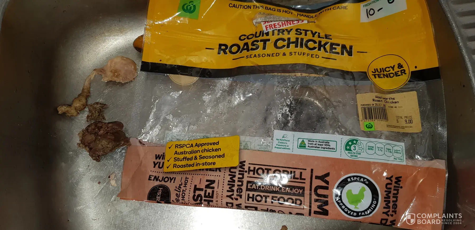 Every friday i purchase a barbeque chicken and we pull it apart and put in a container. Today 26, 10, 18 upon pulling apart the chicken there was only half the usual amount of seasoning. On further inspection i pulled out the cooked stomach, liver, kidneys, lungs, heart and esophagus.