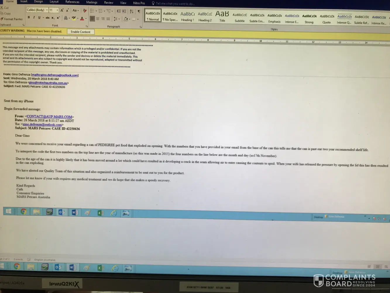 I wish to bring this to your attention as the issue involves extremely poor quality control and a significant safety risk on grounds on potential injury to humans and a risk of food poisoning if eaten by the dog. I will attached corresponding emails between me and customer service of Pedigree for your reference. It appears that Pedigree hold no claim of responsibility for this event or potential future events.