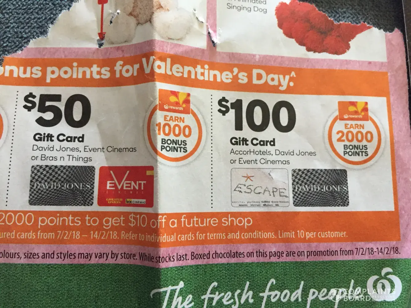 Today I wished to purchase a David jones gift card as advertised in your catalogue for Valentine's Day. I picked up a gift card underneath the $50 David jones card which I thought was a $100 David jones one. The card is identical in colouring and similar wording which is very misleading. Both say "the perfect gift card" on the packaging. I went straight back to my local store 2 hours after I realised it wasn't a David jones card and they said they couldn't swap it over. If you are going to have displays in your stores, you shouldn't have 2 cards almost identical together, as it is very misleading. I'm sure I'm not the only person this has happened to. I have attached photos of the cards to show you and also the promotion advertised. Regards, Debbie