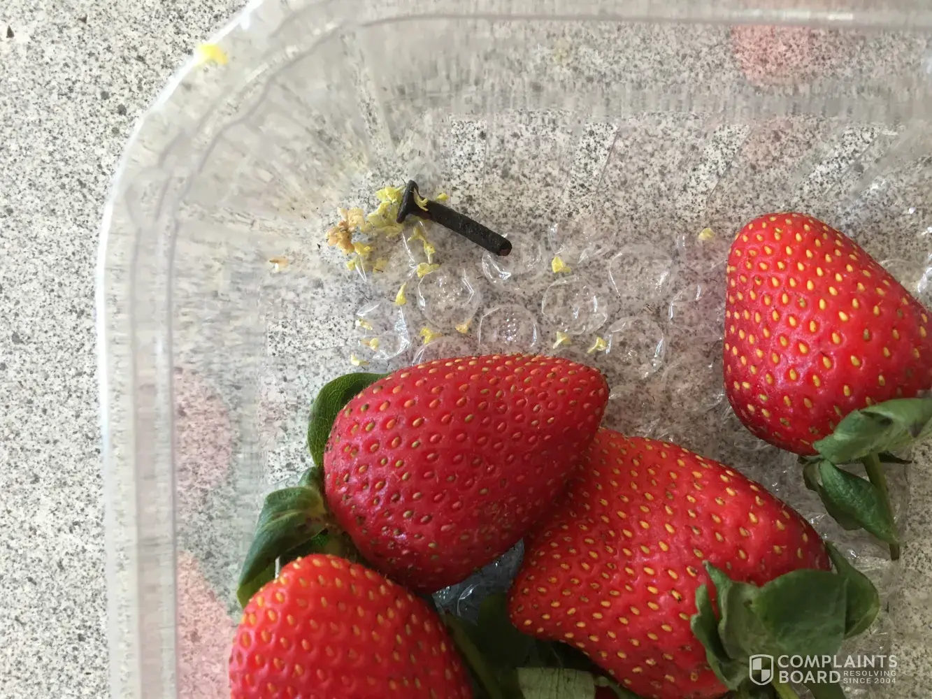I purchased a punnet of strawberries on Monday the 31st of October at your Raymond terrace store. My daughter daughter had been eating the strawberries fresh from the container when I noticed something in the bottom of the container it was a nail I am so so lucky that my daughter did not put it in her mouth as she is only 2 years of age! I am quite upset about this as I can only imagine what could of came from this had she swolloed it :(