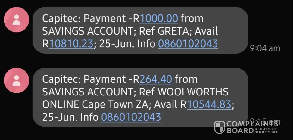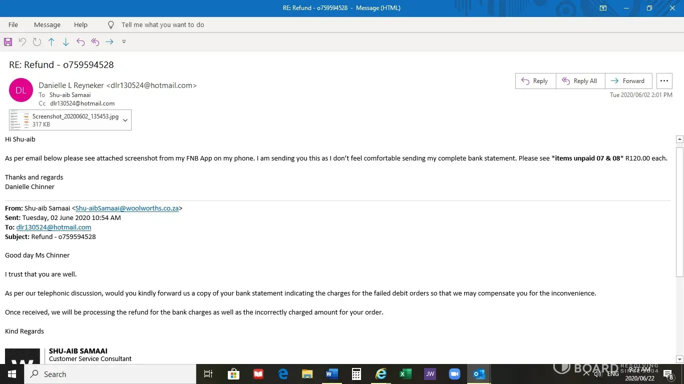 There are two screen shots on the one for 25 June 2020 see the amount paid to Woolworths R264.40 and check the the amount it has taken from my account. So you can see that you guys did indeed receive the R264.40.