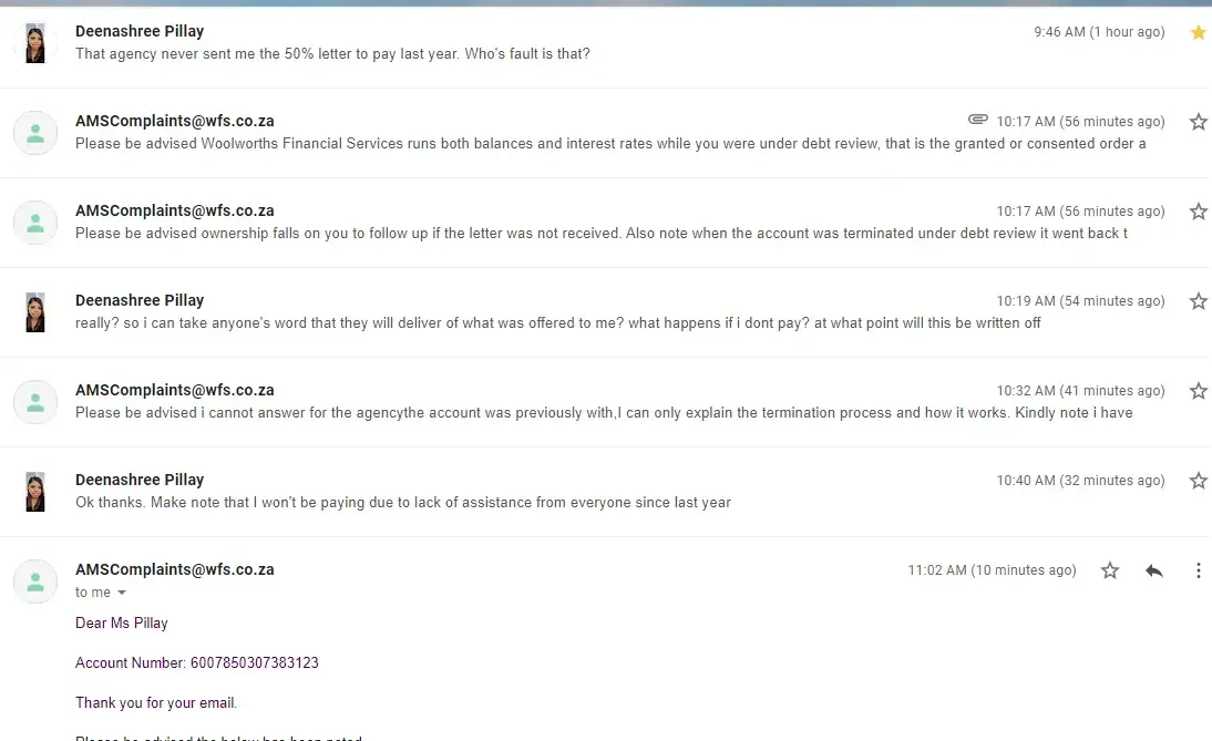For 9 years i paid woolworths via debt rescue. when covid happened, i had to terminate as I had no income. last year i tried to settle my woolworths account, WHAT A NIGHTMARE. I was offered a 50% settlement which i accepted telephonically. i awaited the email but it never came. i emailed and call, still nothing. here i am begging almost a year later for woolworths to honor the offer to me. from a balace of R 2k plus, its now R 7888 (exploitation much)