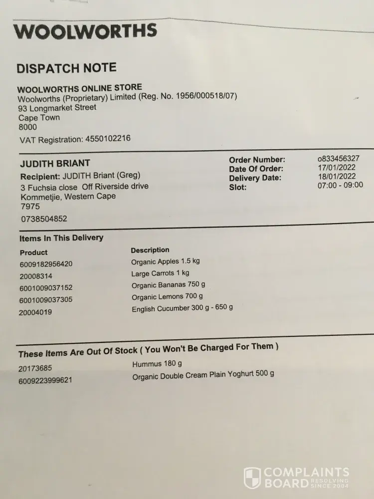 Yesterday afternoon 19 January I went to Customer Service at Woolworths, Longbeach, Noordhoek and asked a manager there if I could collect the two missing items and take them for free as I have already paid for them. I had the note with me saying I would not be charged for them, when I actually was.