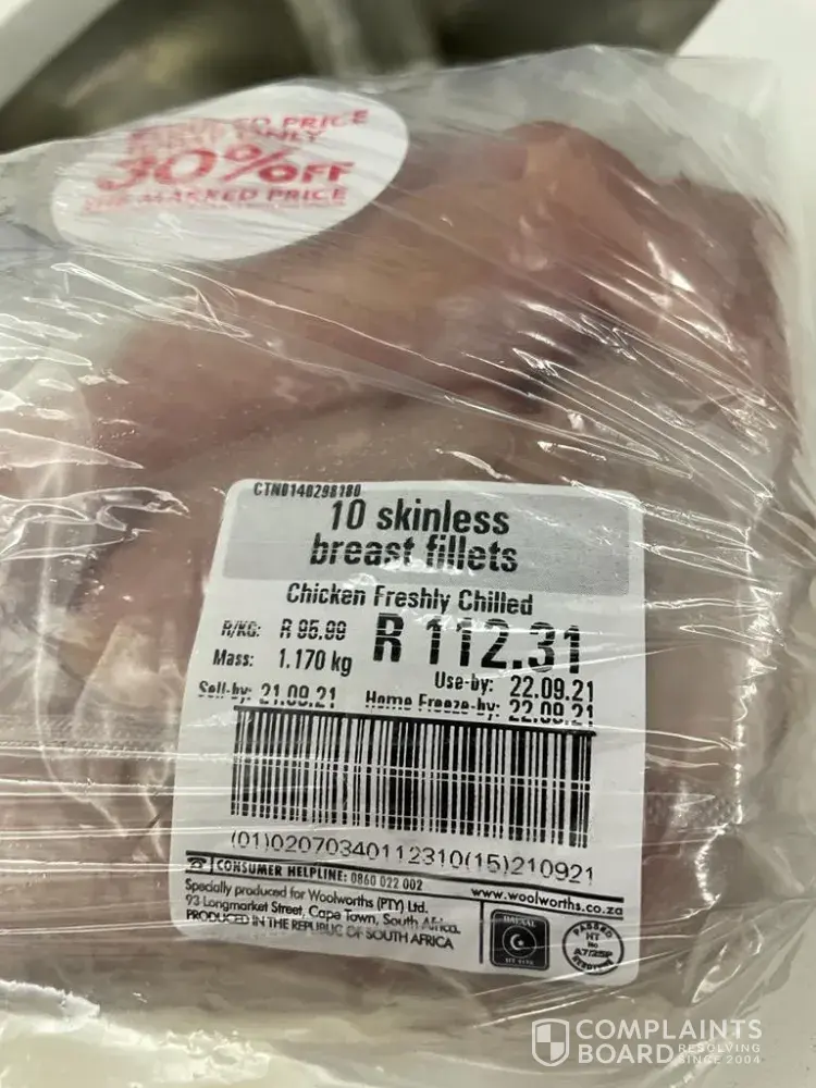 I bought a packet of 10 sealed chicken breasts today from Woolworths at the V&A Waterfront in Cape Town (together with other groceries) at 14:36 using my Discovery card (c Abrahamsohn). When I cut open the sealed packet of chicken breasts you could immediately smell that they were off, releasing a terrible odour. I got 3 members of my family to smell them and they all agreed the smell was awful and we certainly did not want to risk becoming violently ill.