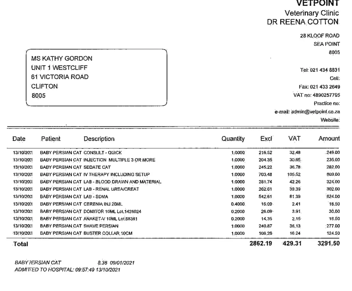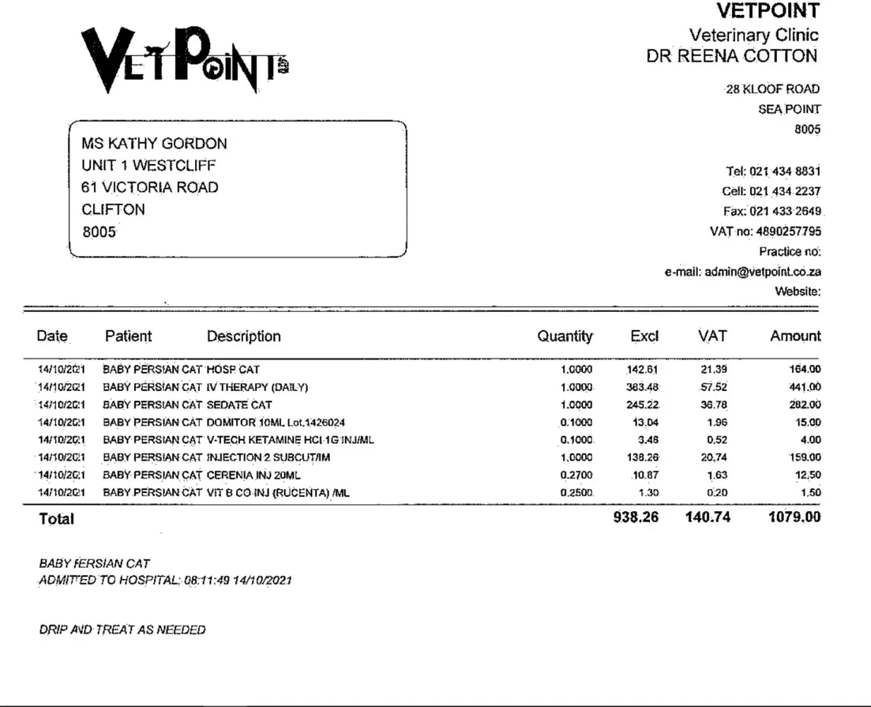 I have attached the relevant vet invoices and pictures of the plant and my cat, Baby. Please kindly open BOTH attachments.