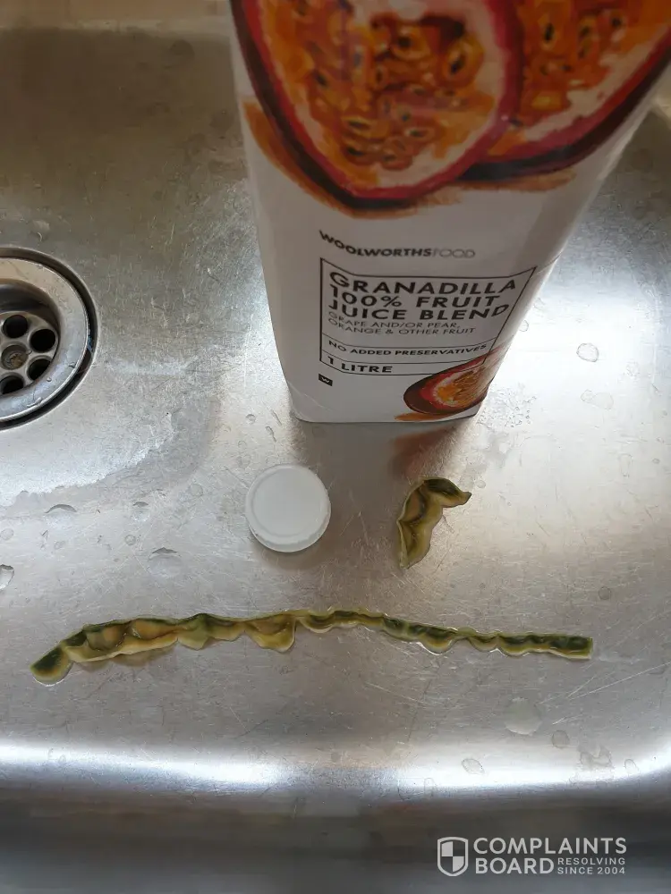 Woolworths has acknowledged this incident and offered a R150 voucher but I cannot actually get any response from them regarding what this green item is that I ingested whilst drinking this granadilla juice.
