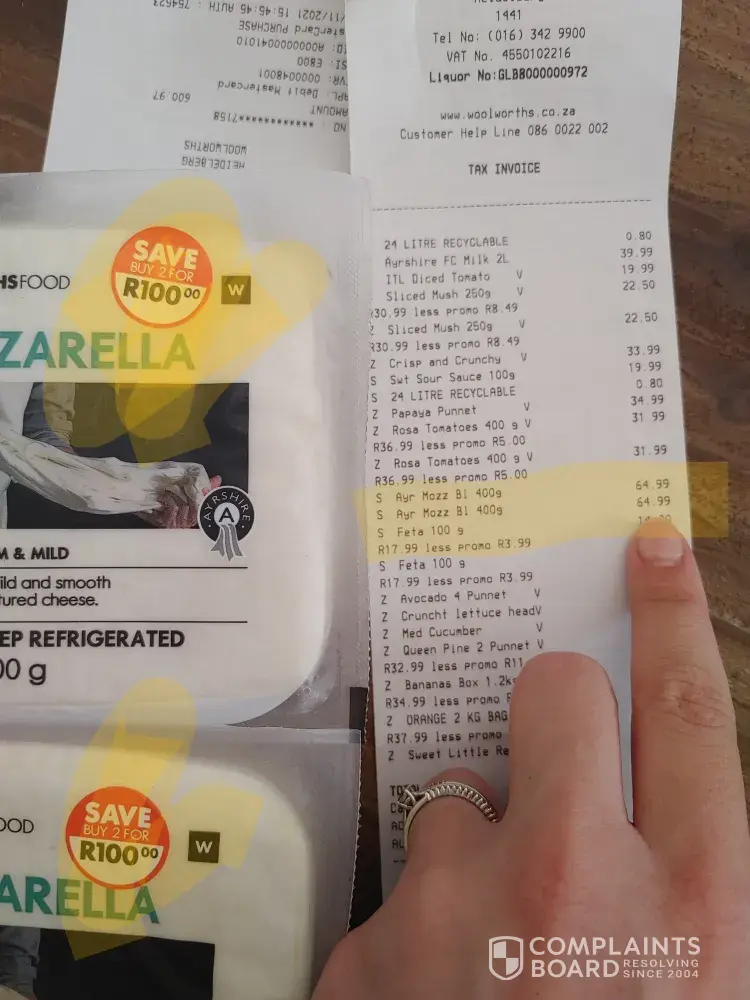 We have been loyal Woolies customers for years. Despite them not being the cheapest place to shop we believe in quality and their vision. Being a governing body teacher we always shop for specials, obviously. Woolies have some very good specials and we love that even more in this economy. The past year hoever I have been getting fed up, things are marked as on promotion/special, for example, yesterday 2 x 400g cheese for R100 instead of the normal R65 per 400g making it R50 per 400g, great goes in basket with other specials. Just to get home and see that the rang it through on the normal price R65 x 2. And if this was the first time this had happened, fine BUT this has has been happening now numerous times.