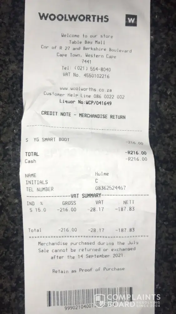 Woolworths South Africa Product complaint