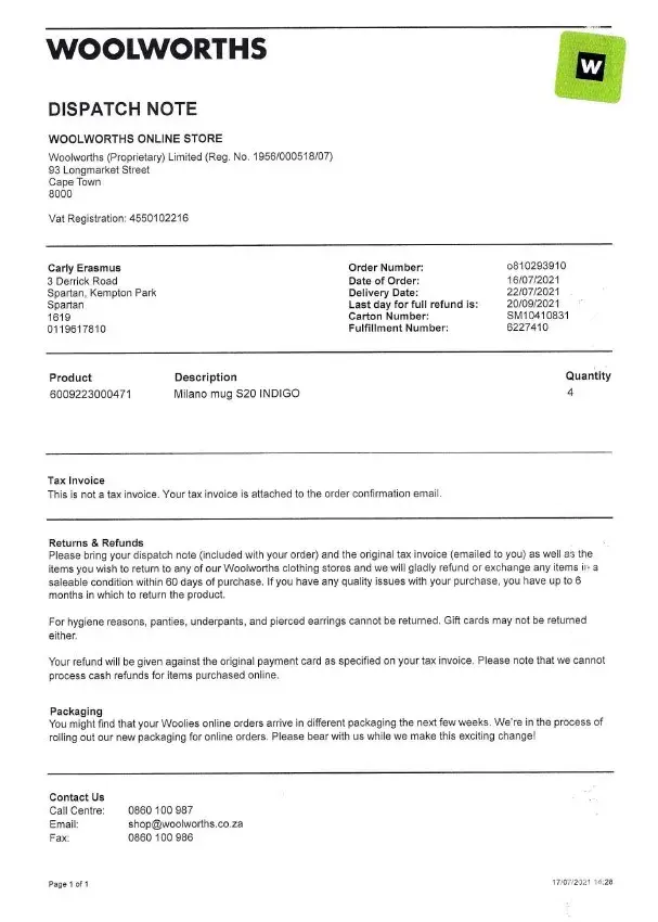 The store this came from is Woolworths Cavandish which is in Claremont, Cape Town. It seems a person by the name of 'Andi' did the packing as the name is written at the top of the checklist / dispatch note.