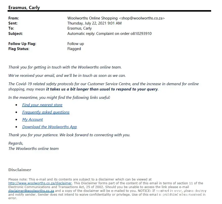 I sent the below complaint to Woolworths on Thursday, 22 July 2021 and still have not received any correspondence other than an email acknowledging receipt of our email.