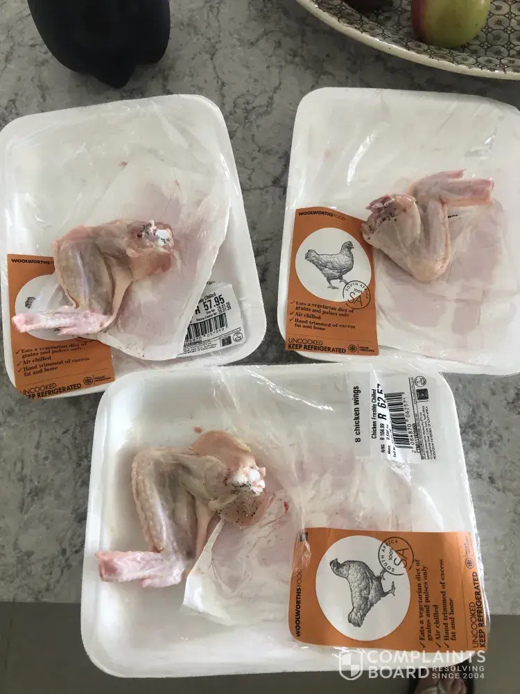 Bought 3 packs of chicken wings from George woolies, at least one wing in each pack had black speckles on them . Not too easy to clean had to cut them off .