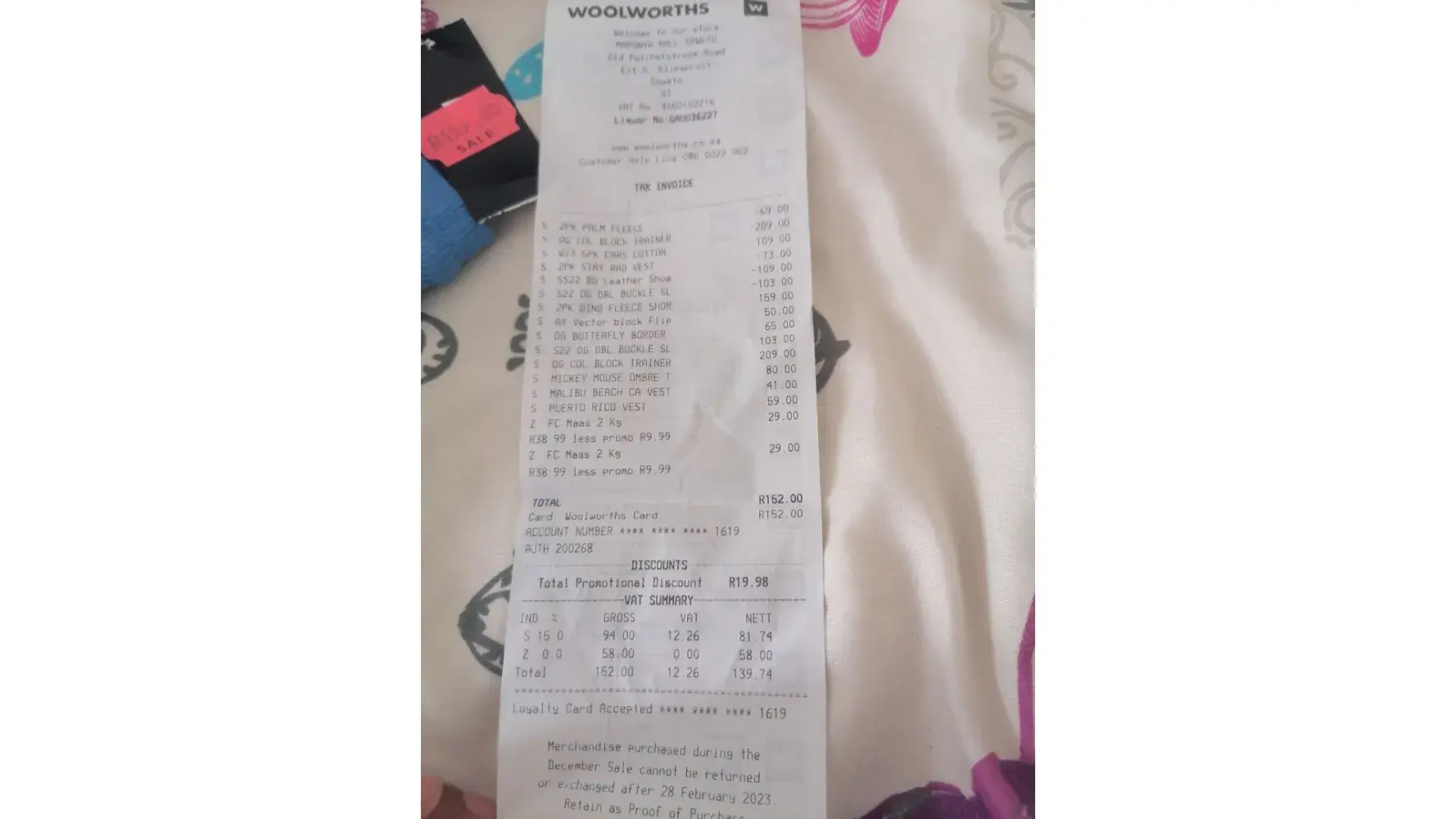 I bought baby shorts at Woolworth maponya mall on the 25 January 2023 only to my surprise when I get home I pay the 50% sale and it was on the 65 % sale original price was R199 and on sale I paid R159.