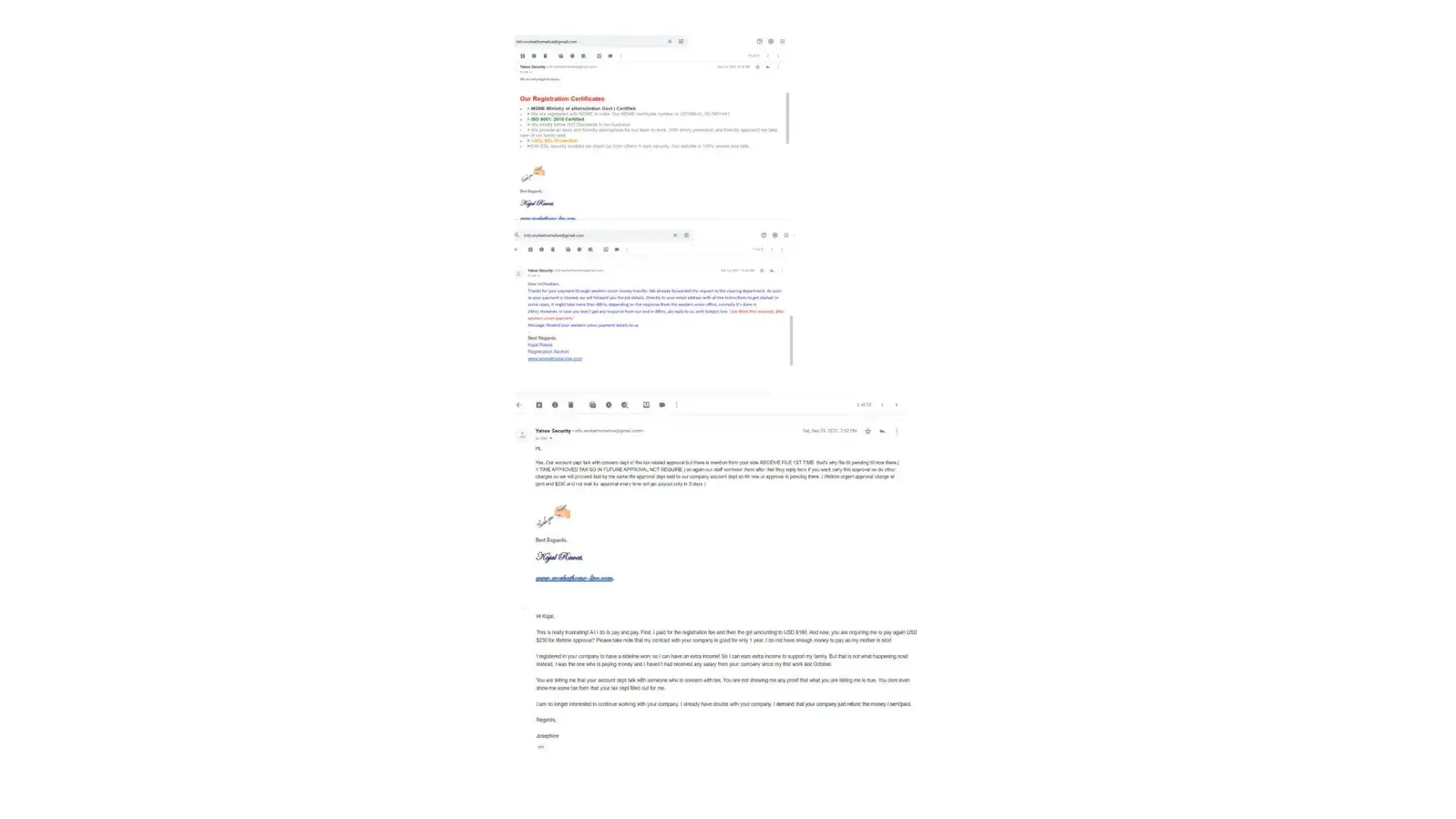 After sending my payment via Western Union, I followed them up about the payment and requested them if they can already send my salary. After several days, they informed me that there is a problem with the processing of my salary and I need to pay again the amount of $230. This is for the one-time fee so that my salary will process within 3 days and I will no longer wait. Because of this, I told them that I am no longer interested to continue working with them because they keep on asking for money. I told them that the reason I applied to work is to have an extra income, but instead, I was the one who is sending money to them. Then I demanded Kahal Rawat to return all the money I paid to them. After that, they no longer replied to my emails. I keep following up on my emails but there's no response from them. The person I communicate with via email is Kajal Rawat and the person who is receiving the money from Western Union is Aub Mirza.