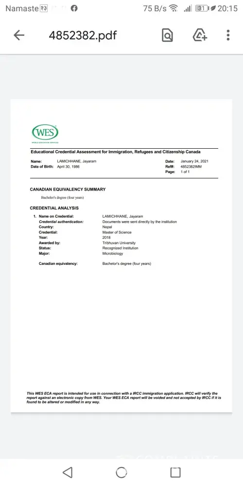 Dear sir/ madam, My WES no. is 4852382. I have completed my bachelors degree in microbiology from University of Texas at Arlington and my master’s degree from Tribhuvan University in Nepal. As mentioned in website I only sent my master’s degree certificate and transcript to WES. And when WES sent me the evaluation form it sent my masters' equivalency as 4 years bachelor in science. I don't really know how WES comes to this conclusion. My doubt is that WES assumed my bachelors degree is 3 years which most of the students in Nepal have. In Nepal however most of the bachelors degree is now 4 years. I would request WES to reevaluate my certificate and transcripts and if required I am ready to send my bachelors degree certificate and transcripts as well. Yours faithfully Jayaram Lamichhane (lamichhane.[protected]@gmail.com) +[protected]