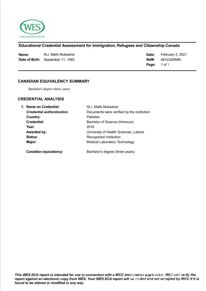 with due respect, it is stated that I have done my four years professional programme BSc (hons) Medical Laboratory Technology (MLT) from University Of Health Sciences (UHS) Lahore Pakistan which started from 23rd january 2012 and ended on 17th may 2016 clearly mentioned on my transcript and degree. on January 16, 2021 I applied for international equivalency to World Education Services (WES) with Reference number #4812328. it issued me three year bachelor degree equivalency. there is no institute/University in world which is offering three years bachelor programme in Medical Laboratory Technology which I have done. my degree is as according as the four years bachelor criteria of any university in world. on the equivalency issued by WES, I can't be able to apply for further licensing to work in my profession. in this way, it can be worsely effect my survival as I knows only that skills.