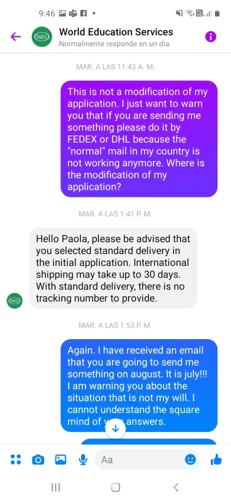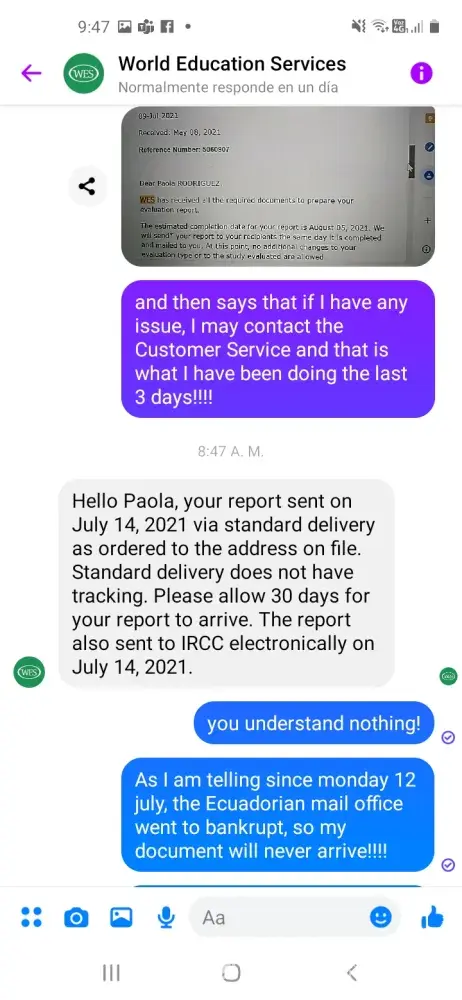 My english transcript from my German 10 years of "Realschule" school was accepted and also my Bachelor degree which was a Bachelor Professional of Hotelmanagement (Hotelmeisterin) by the German Chamber of Commerce and Industry issued in english was accepted and I followed up online through my account and they sent me by E-mail updates. What they have not accepted was everything else and I needed to contact 4 institutions to have my transcripts translated from German into English and to have sent the German and English version of each transcript to WES in a sealed stamped envelop. This has cost me alot of research and contacting every institution. I had to pay the chamber of commerce and industry in Franfurt am Main a fee of 70 Euros for having issued an additional suporting document that stated that my Bachelor degree was valid and the signature on there aproved by Government bodies. The chamber of commerce and industry in Freiburg requested a fee of 25 Euros for having my aprenticeship certificates issued in English and German and sent to WES. The chamber of commerce and industry in Mannheim has cost me alot of effort to having those certificates issued and sent to WES, since they were hesitant to issue them at all, but did in the end for my Instructor education and sent them to WES as well. My school in Germany issued me the transcript and sent it with a letter to WES as well. Then the nightmare started. I received my report firstly online and later it was sent to me in July 2021 (issued June 25th 2021). But on my report have been missing my instructor education and my bachelor degree. Both my instructor education and the bachelor degree are belonging in Germany together. I thought ok mistakes happen and Canada does not know our education system and their education system might be different as well. So I contacted since June 2021 WES through several messages. I asked them why my bachelor degree was not on the report and if the transcripts had arrived from the chamber of commerce and industry. But they failed to give me an answer! For instance I messaged this to WES: