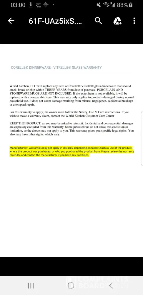 I received a timely email from World Kitchen after my complaint was forwarded by www.complaintsboard.com. The email stated that I was not covered under a 3-year warranty for the product because I dropped the dish. I am NOT looking to get anything free. I am reporting, after reading all the complaints and having some of my own, that these dishes need to be removed from the market because of the safety hazard they pose. I understand I just dropped my plate and that is not the company's fault but, the plate shattered into hundreds of pieces and flew all over. This also happened with a cup I dropped. Also, upon reading other customer's complaints (which I assume are true) plates, etc. are shattering while in the cupboards, being washed, etc. This is VERY dangerous and someone in the company should be seriously checking this out.