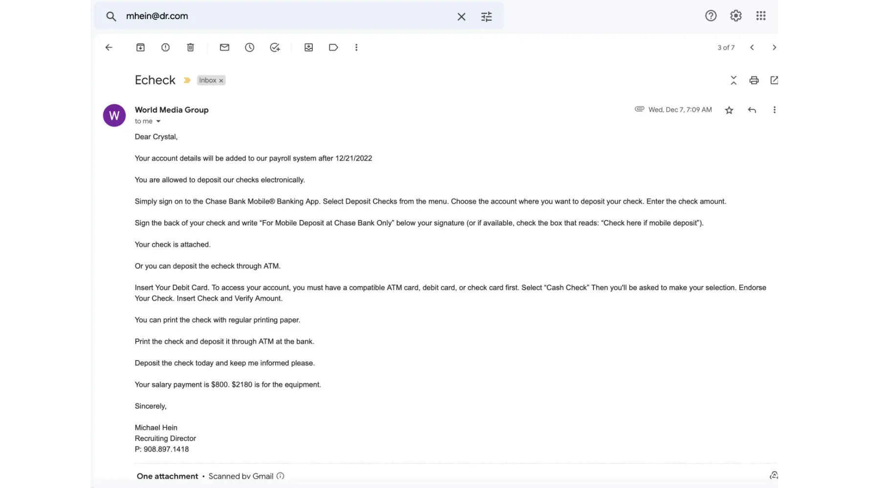 I was "hired" by a recruiting agent from world media group who called himself Michael Hein. His email is [protected]@dr.com. He said that I needed a fingerprint accessed laptop which I had one (MacBook Pro) he claimed that the companies software isnt compatible with Mac and that I needed a specific gaming computer. That was the first red flag. Then he said that I'll receive a direct deposit for the laptop plus the software and 800 wages for myself. THAT WAS A HUGE RED FLAG! Why would you pay me for work I hadn't done yet? Then he emailed a e-check and said I had to print it out and deposit it into my account. At this time I started asking alot of questions that obviously made him angry cause he emailed me back and said that if I didnt trust him and thought he was scamming then I should look for employment elsewhere. At this point, I knew it was a scam but I wanted proof it was a scam. I decided to call my banks fraud department and let them know what happened. I then deposited the check for my bank to verify. My bank contacted me and said that they couldn't verify the check meaning that the check was fake. Thats when I found the complaints from other victims. I get dozens of emails and text messages a week for job offers that are scams. After responding to them they always want to send me a check. No legit job will ask you for money or send you a check. If office equipment is required, they will send you the equipment or they will inform you beforehand what is required for the position (laptop, microphone, camera, high speed internet).