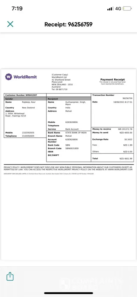 I am not getting any response from worldremit . I am sick of it. It was $4000 nz dollars.