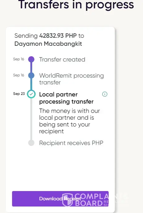 WorldRemit Agent Michael Diofre (7/8/2021, 7:54:34 PM): I can see that this has just been forwarded as of yesterday. Please just wait for notifications as this is still currently being worked on.