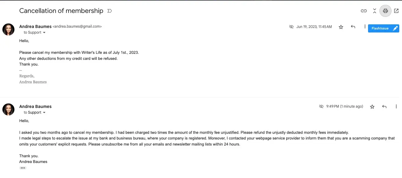 I notified the company on Mon, Jun 19, 2023, at 11:45 AM to cancel my membership as of July 1, 2023. They omitted my request and did not respond to my calls or contacts. They have charged my credit card with the July 2023 and August 2023 monthly fees. Their services lack quality and are out of control with spam messages.