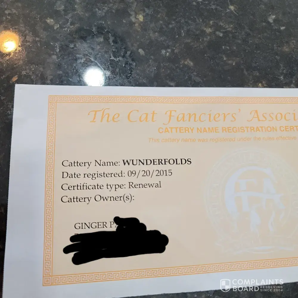 So many lies Darlene. Here is a photo of my registration with CFA, and I find it odd that you were provided registration papers for TICA if I'm not registered. Try again. I've already addressed all the other falsehoods in the multitude of negative reviews Darlene has posted, but this is more proof of the smear campaign she has against me.