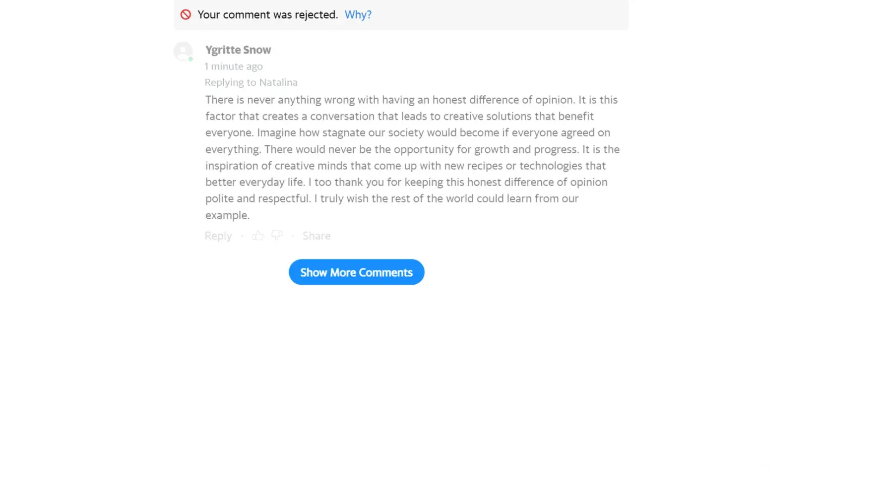 I am a bit confused as to why such a benign comment would get rejected. This was amicable and polite. Why are such innocent efforts at polite discourse being rejected?