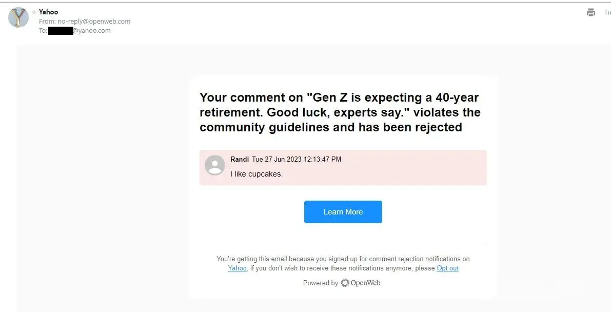 Artificial Intelligence is just that! Artificial! Which can not think or comprehend meaning only rejection! Sadly this is only one of many statements rejected by Yahoo that only angers myself and others when trying to convey a simple truth or fact while so many of their articles have been proven fake news. Where can we reject their fake news articles in all fairness? Too many have ended up being racially divisive which I thought would never have happened! Yahoo has turned the clock back 59 years! For new readership!