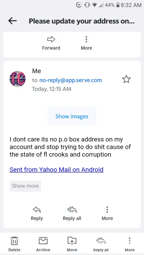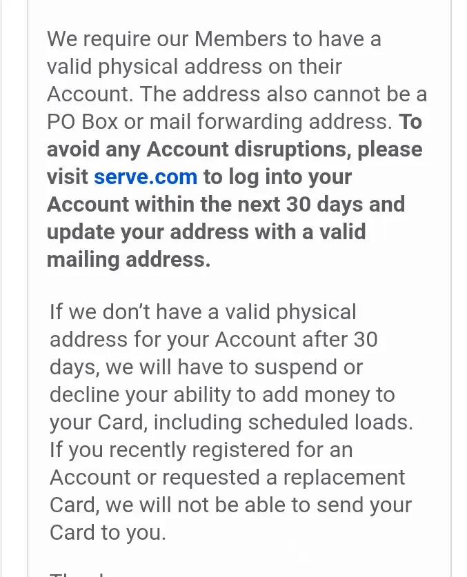 On 5/13/21 i recieved a fake document from American Express saying to update my address from a P.O Box you have to make a account for the American Express Serve card which i choose to get when i filed my taxes the last four yrs with Jackson Hewitt and i haven't put any p.o box address when i made that account and i filed my taxes with HR Block this yr 2020 not jackson Hewitt because jackson hewitt have been emailing me alot and those serve cards are prepaid cards not a regular creditcard so you have to load money on them when you want to use them after i withdrew my money off the serve card from my taxes i never use those cards so thats why i sent a reply to that fake email and im going. to contact American Express personally just another plot by the state of Florida to cover up their corruption