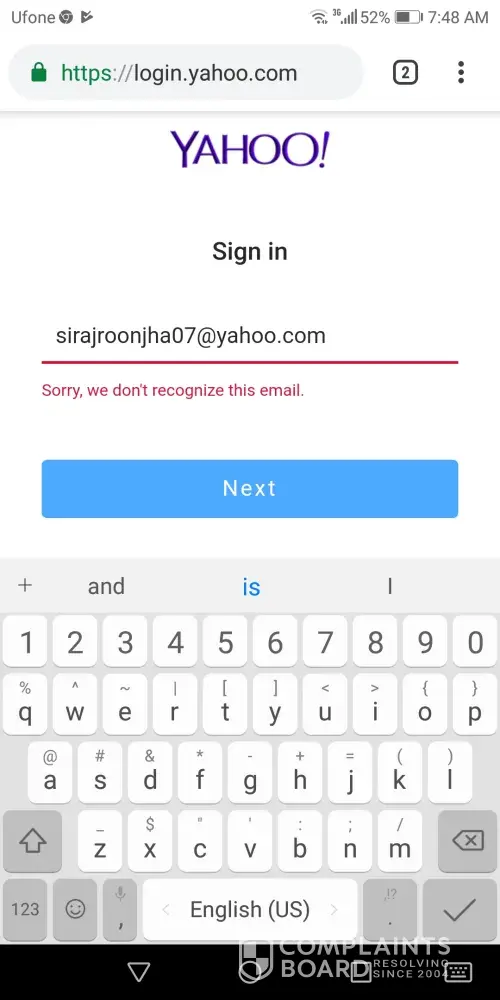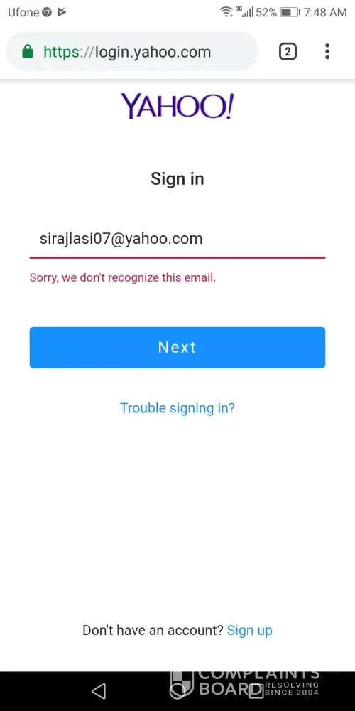 I am complaining about `my not recognize email`