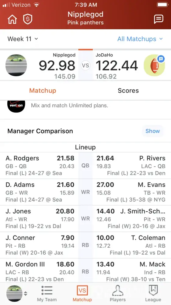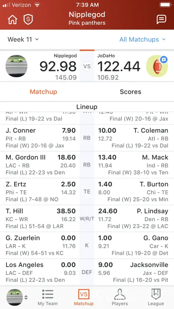 So I just played a friend in yahoo and we are in week 12 just finished week 11. It was a close match in week 11 I needed 30 points to win and I had tyreek and Greg Zuerlein. Greg Zuerlein on fantasy says he got 0 points which he didn't he got 12 and tyreek got 38.59 therefore I win but yahoo gave me the loss and didn't add any of the points to match. The same thing happen to all the other teams in the league and everyone is very angry. Please fix this so at least are wins are switched. It would mean a lot.