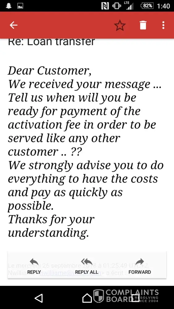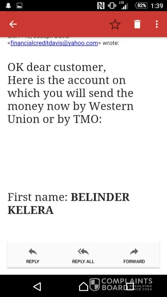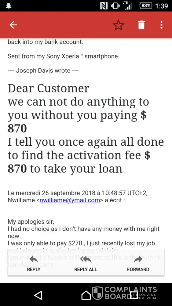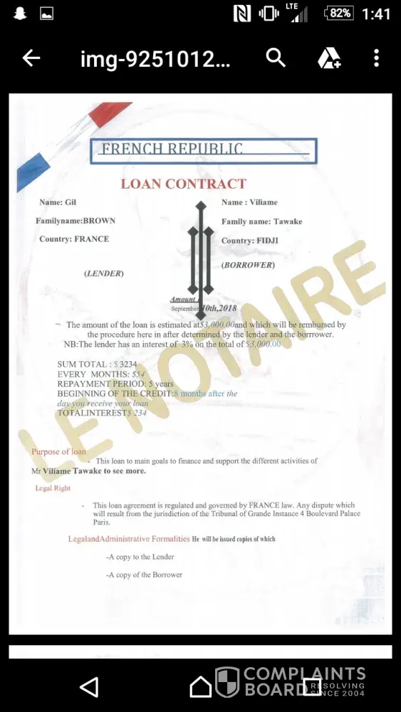 I had email this peson about a loan application, as I was in need of money. Iam from Fiji Islands and I had contacted this person who said he was able to provide loans amounting from three thousand to three million dollars. Given how persuasive he was I was drawn to his scam and followed every procedure. As I paid the fee of $290 to Alisi Mei whom he said was the agent here in Fiji. After which he said that I contact another person named Joseph Davis, who said for me to pay $870 again before I get the loan. After much consideration I said enough because I finally realized that I was incurring a loss rather than getting a loan.As I asked for a refund he has been silent ever since.
