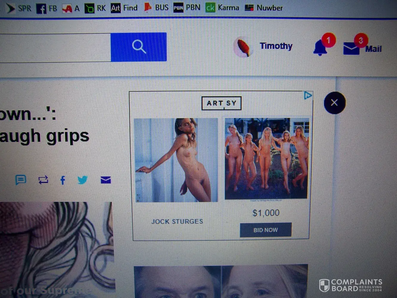 I want an apology to go along with my lengthy explanation. I have used Art-sy before, and I'm used to pop-up ads, but I know you have only selected a few sensational images, as they are RIGHT NOW appearing rapid-fire in the left & right margins, as I'm writing this! I am also writing to Yahoo and will have to consider getting a lawyer if my job is in jeopardy.
